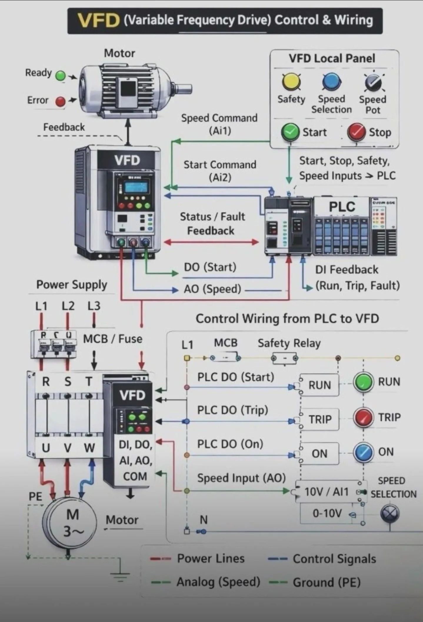 B.PLC (The Brain): The PLC receives inputs from the local panel and sends commands to the VFD.